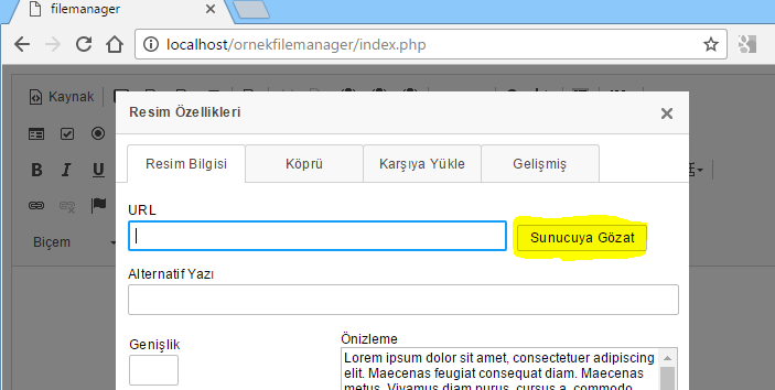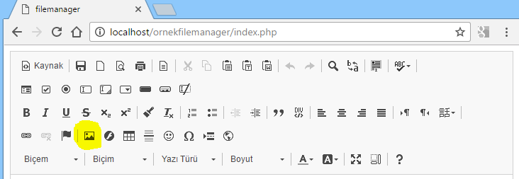 Daha sonra CKEditor’ün file manager’ı görebilmesi için gerekli kodları ekliyoruz. Burada file manager’ın dosya yolunu doğru yazdığınıza dikkat etmelisiniz.